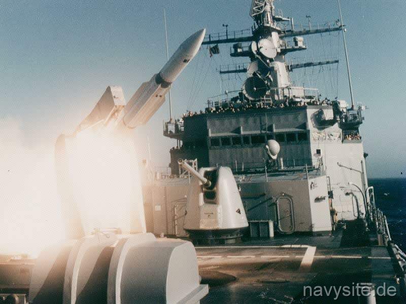 Эти "блюдца" здесь, между прочим, не просто так. Это антенны радаров AN/SPG-61, сопровождающих воздушную цель и "подсвечивающих" ее для полуактивных головок самонаведения ЗУР "Стандарт".
